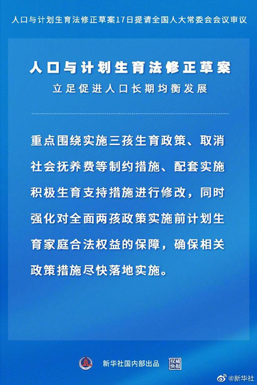 인구계획출산법 수정초안이 17일 13기 전국인대 상무위원회 심의에 제청되였다. 초안은 총 26조가 있는데 주로 중국공산당 19기 5차 전원회의 정신과  요구를 락착하고 인구의 장기적 균형발전에 립각해 세 자녀 정책 실시, 사회양육비용 취소 등 제약조치, 적극적 출산 지지조치 실시를 둘러싸고 수정을 진행한다. 동시에 전면적 두 자녀 정책 실시전 계획출산 가정의 합법적 권익보장을 강화하고 관련 정책조치의 빠른 착지와 실시를 확보했다. 세 자녀 출산정책과 무관한 내용에 대해서는 원칙적으로 이번에 수정을 진행하지 않는다.